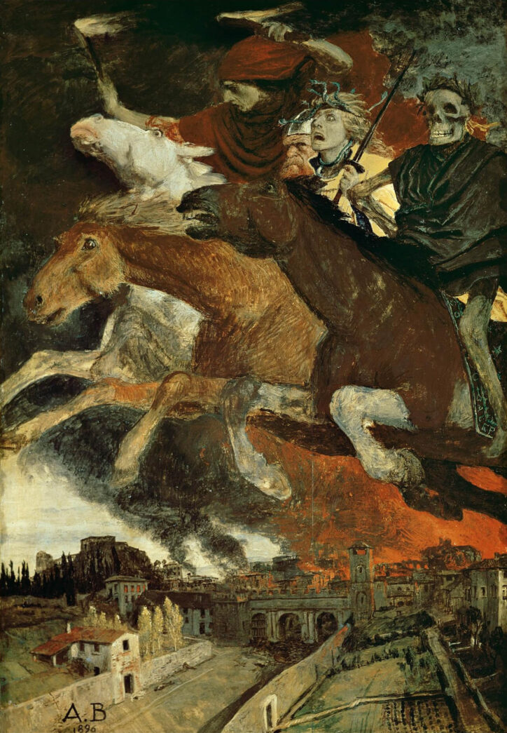 Im Evangelium wird berichtet, dass Johannes in einer Vision ein Buch mit sieben Siegeln gezeigt wird, das weder ein Mensch noch ein Engel, sondern nur das Lamm Gottes – symbolisch für Jesus Christus – öffnen kann. Beim Öffnen der ersten vier Siegel erscheint jeweils ein Pferd mit einem Reiter.