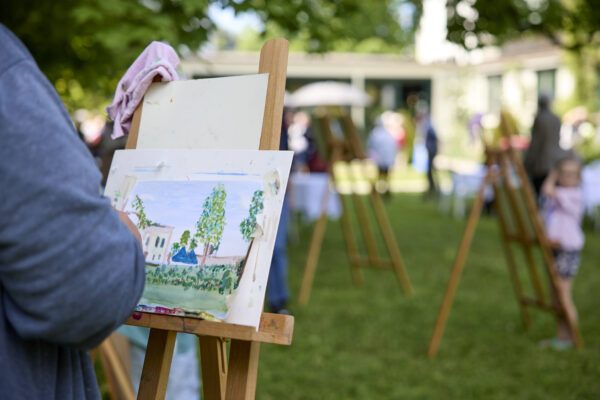 Pinsel, Farben und Staffeleien laden zum Malen im Freien ein.
